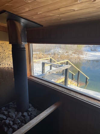 The Perch Sauna very comfortably seats 6 people, has a generous dressing room, a wrap around cedar porch. Perch is perched on a peninsula, with water on three sides. Stairs lead from the wrap around porch into a small shallow cove for dipping, we keep the ice open year-round.